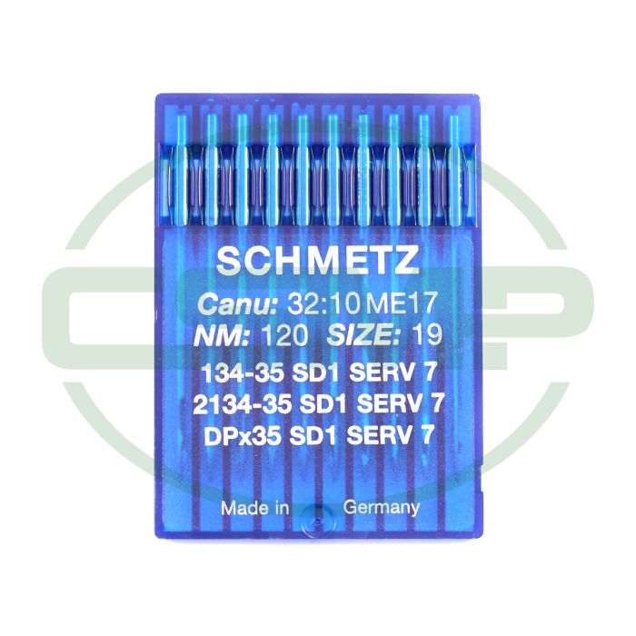 Schmetz 32:10ME17 - 134-35 SD1 SERV 7, 2134-35 SD1 SERV 7, DPX35 SD1 SERV 7 - NM 120 / Size 19 - SD1 (Round point with small triangular tip) SERV 7 Packet of 10 Needles.