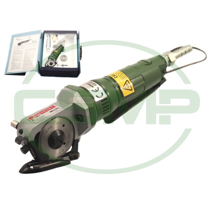 The Suprena PC1062 is a handheld air-powered rotary cutter designed for precise, scissor-like fabric cutting. Equipped with a round knife blade and a carbide-tipped bottom blade, it easily cuts through a wide range of fabrics with minimal effort.